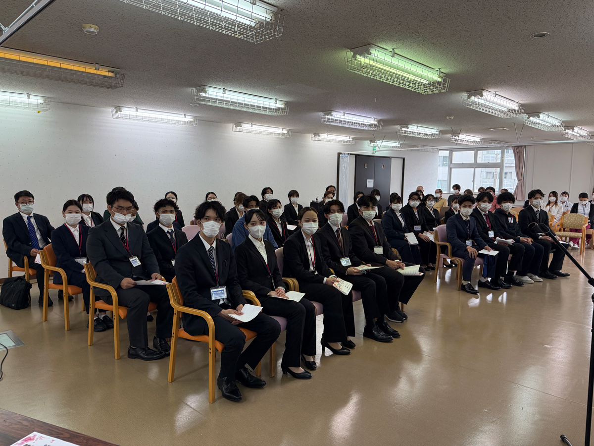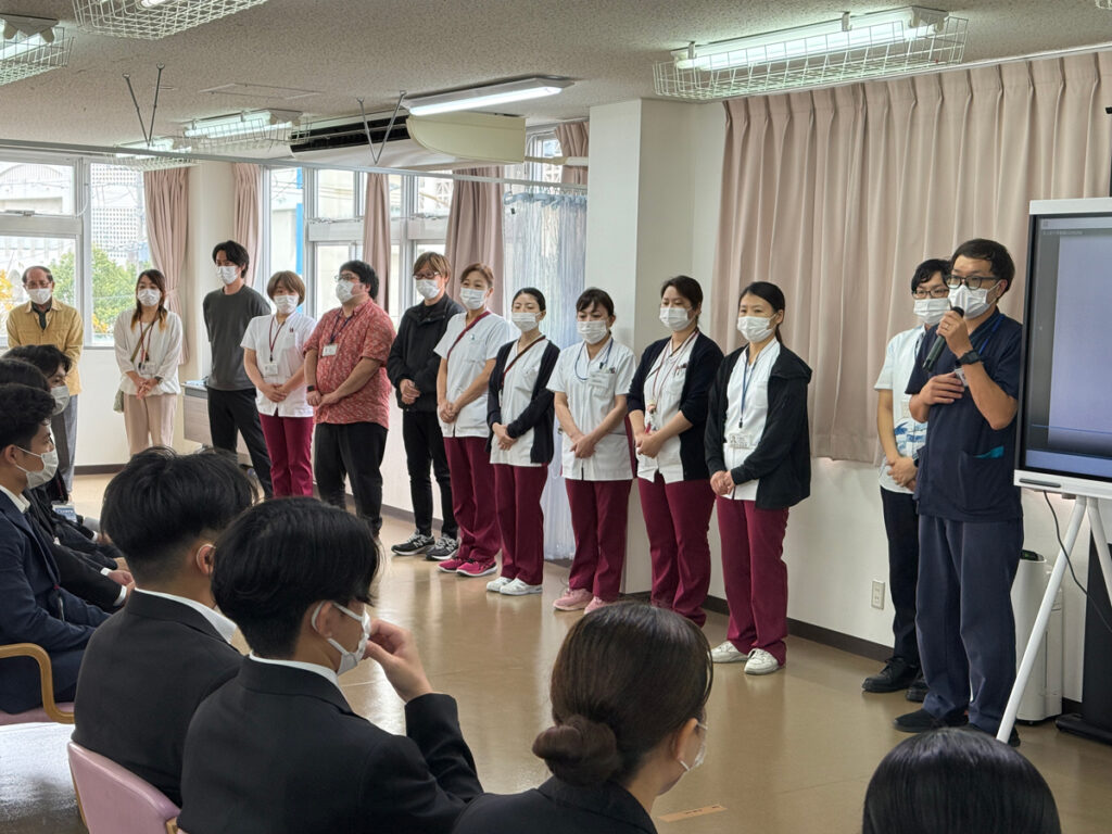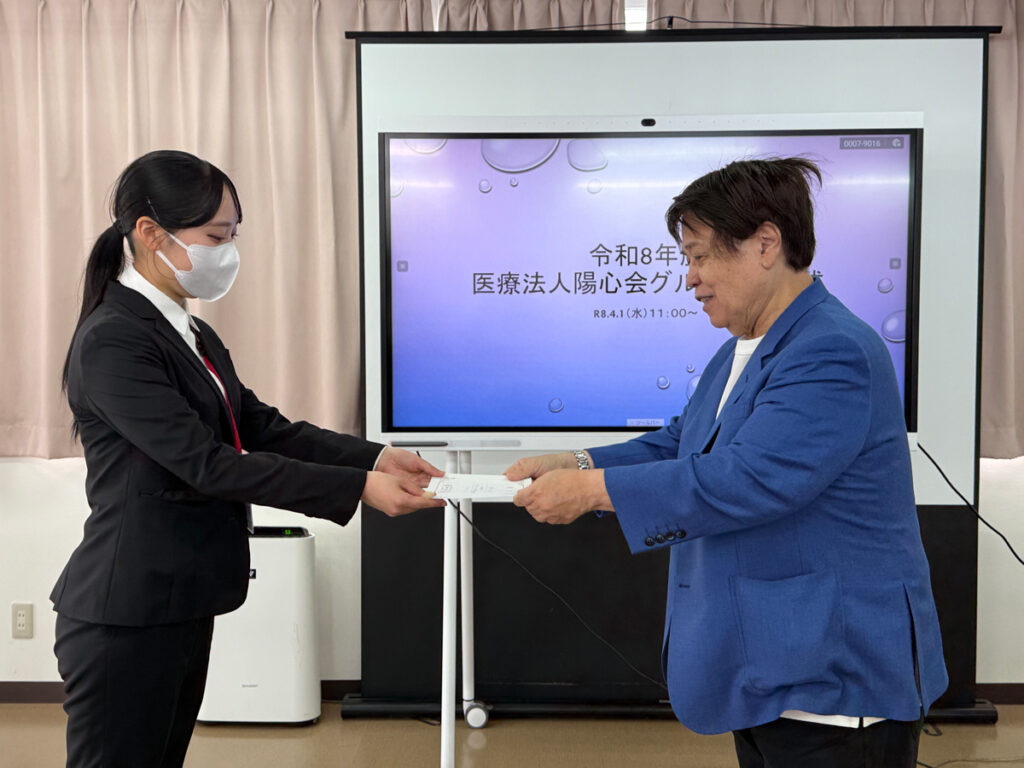 会場のメディカルプラザ大道中央病院大会議室には、4月入職の新職員や法人の幹部職員が一堂に会しました。式には業務の都合で欠席した9人を除く37人の新入職員が出席。代表で辞令を交付された理学療法士の松丸さくらさんは「本日は入社式を行っていただき誠にありがとうございます。患者さま一人ひとりに寄り添い、安全で質の高い医療とリハビリテーションを提供できるよう日々学び続けていきます」と決意を表明しました。高良健理事長はグループの沿革や理念を紹介し、社会情勢や今後の業界の見通しを踏まえて「医療や福祉は経済的な問題ではなく、心の問題として進めるべきだと捉えている。地域のお年寄りを大切にし、その手段の一つとしてリハビリテーションを強化する。地域のためになることを自ら進んで実践してほしい」と訓辞。また「法人には大小さまざまな形態の施設があるが、それらに魂を吹き込むのはあなたたち。職場の上司や同僚と力を合わせ、地域に愛される施設にしてほしい」と希望を託しました。入職した46人は今後、それぞれの配属先で経験を積み、各分野のエキスパートとして活躍されることが期待されています。 新入職員36人と高良健理事長 高良健理事長 高良理事長から辞令を受け取る松丸さくらさん 緊張した面持ちで式に臨む新入職員 それぞれの部署を紹介する配属先の管理者