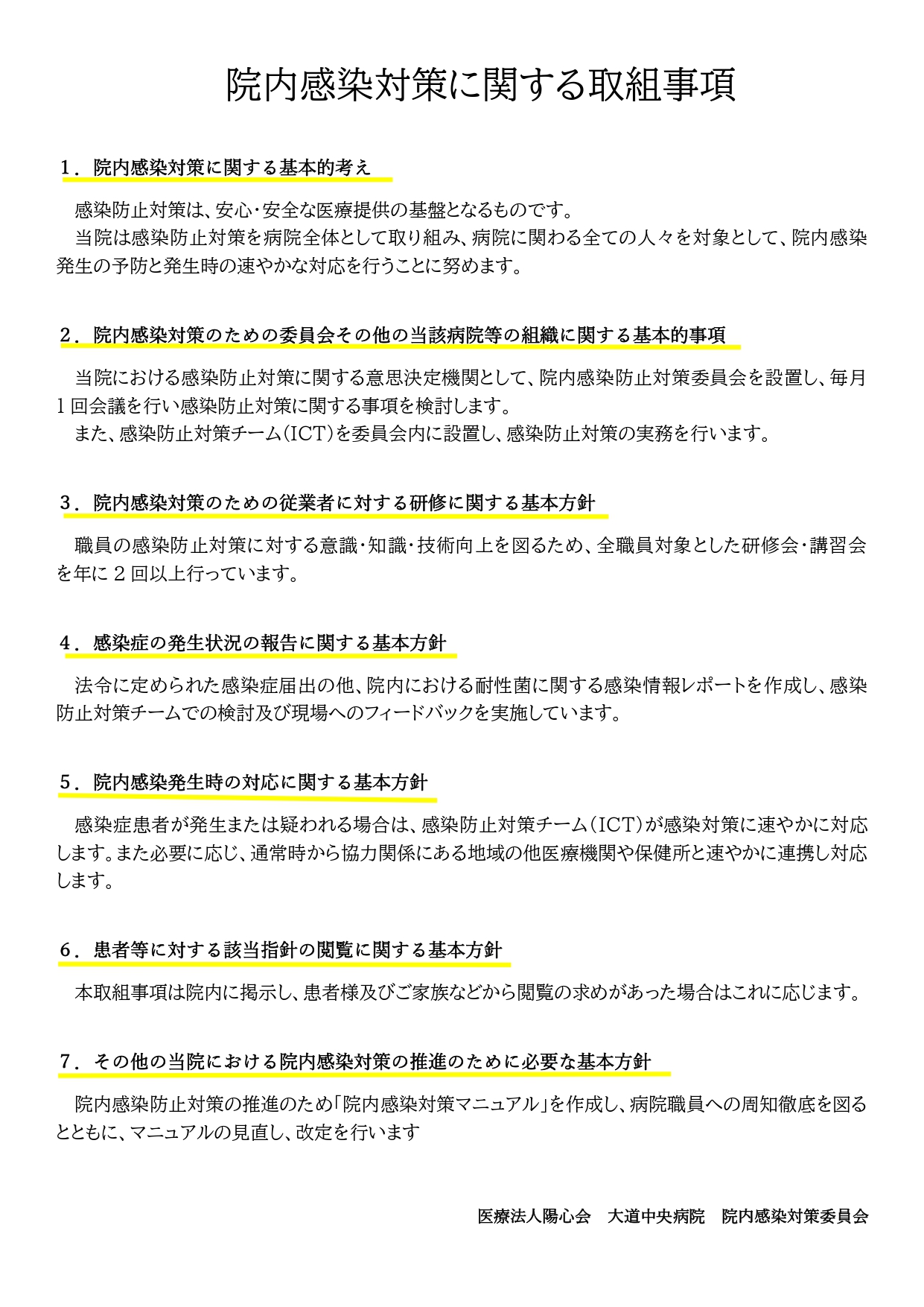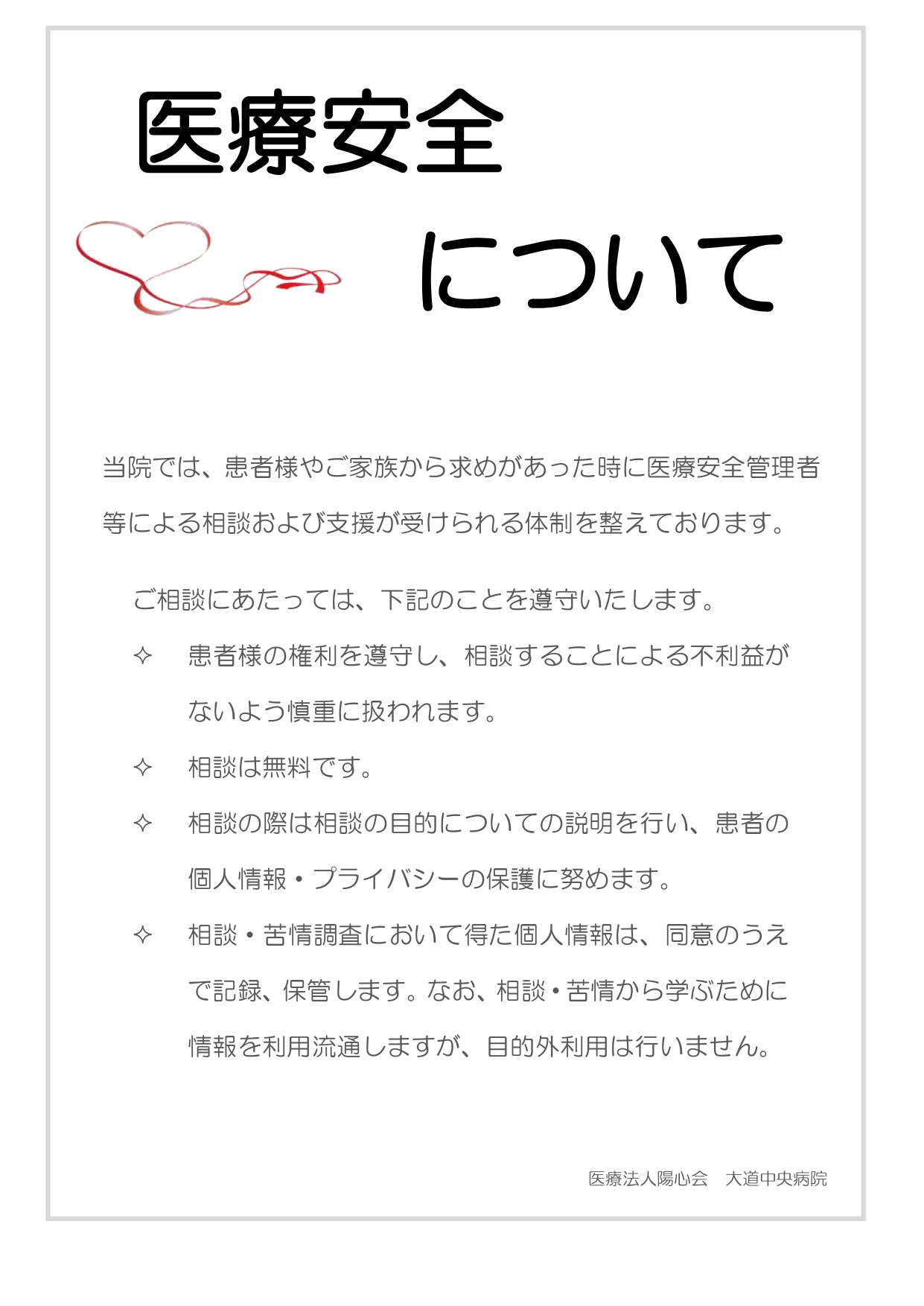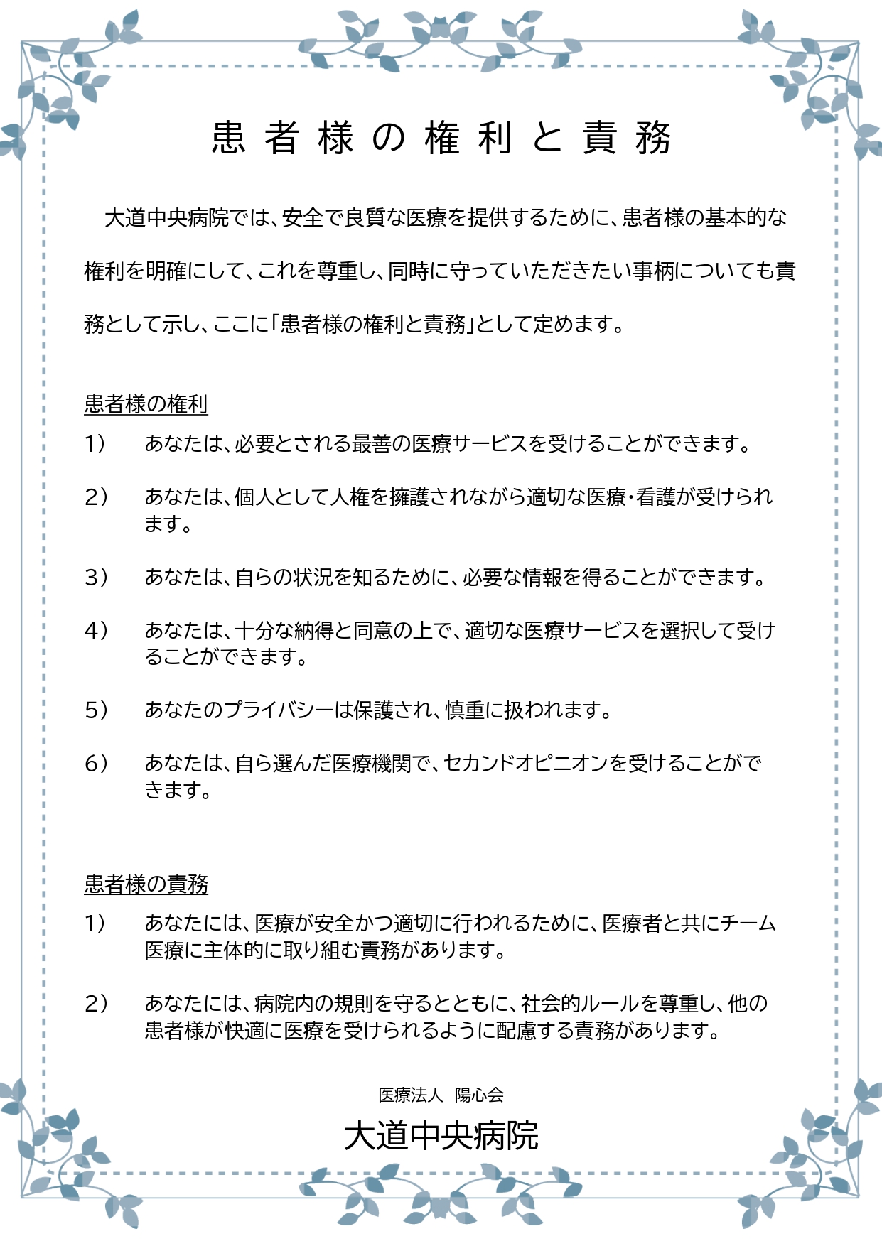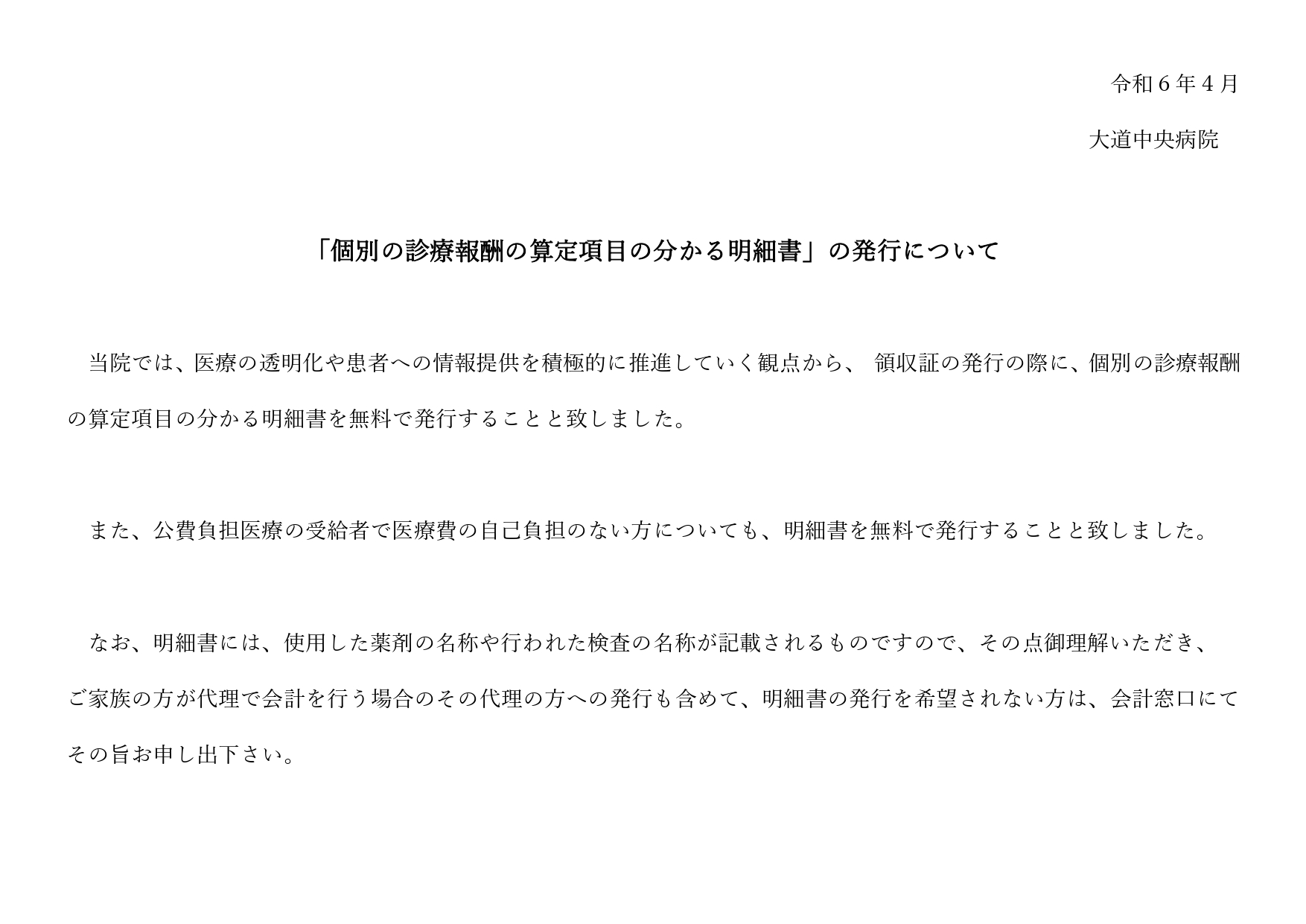 医療法人陽心会 大道中央病院 ■ 大道中央病院 -概要 -担当医の紹介 -病棟のご案内 -理念と基本方針 -医療相談について -患者様の権利と債務 -個人情報の保護について -入院生活について -院内掲示物 メニュー ■ 大道中央病院 -概要 -担当医の紹介 -病棟のご案内 -理念と基本方針 -医療相談について -患者様の権利と債務 -個人情報の保護について -入院生活について -院内掲示物 院内掲示物 2024年度の診療報酬改定を機に、医療法や健康保険法等により、病院内に掲示している書面等を病院ホームページへ掲載することが義務付けられました。大道中央病院では、院内に掲示されている実際の掲示物をそのまま公開いたします。画像をクリックすると、大きな画像でお読みいただけます。なお、掲示物は事前の予告なく更新いたします。あらかじめご了承願いします。 個人情報保護に関する基本方針 当院では患者様の個人情報保護の適切な管理に努めています 健康保険外負担料金一覧表 看護従事者の負担の軽減及び処遇の改善に関する取り組み事項 入院基本料、入院時食事療養費について(2階.3階.4階.5階病棟) 院内感染防止対策に関する事項 医療相談室について 医療安全について 後発医薬品の使用促進について(後発医薬品使用体制加算の掲示) 患者様の権利と責務 診療のご案内厚生労働大臣の定める掲示事項・施設基準の届出一覧 医療DX推進体制整備加算 「個別の診療報酬の算定項目の分かる明細書」の発行について