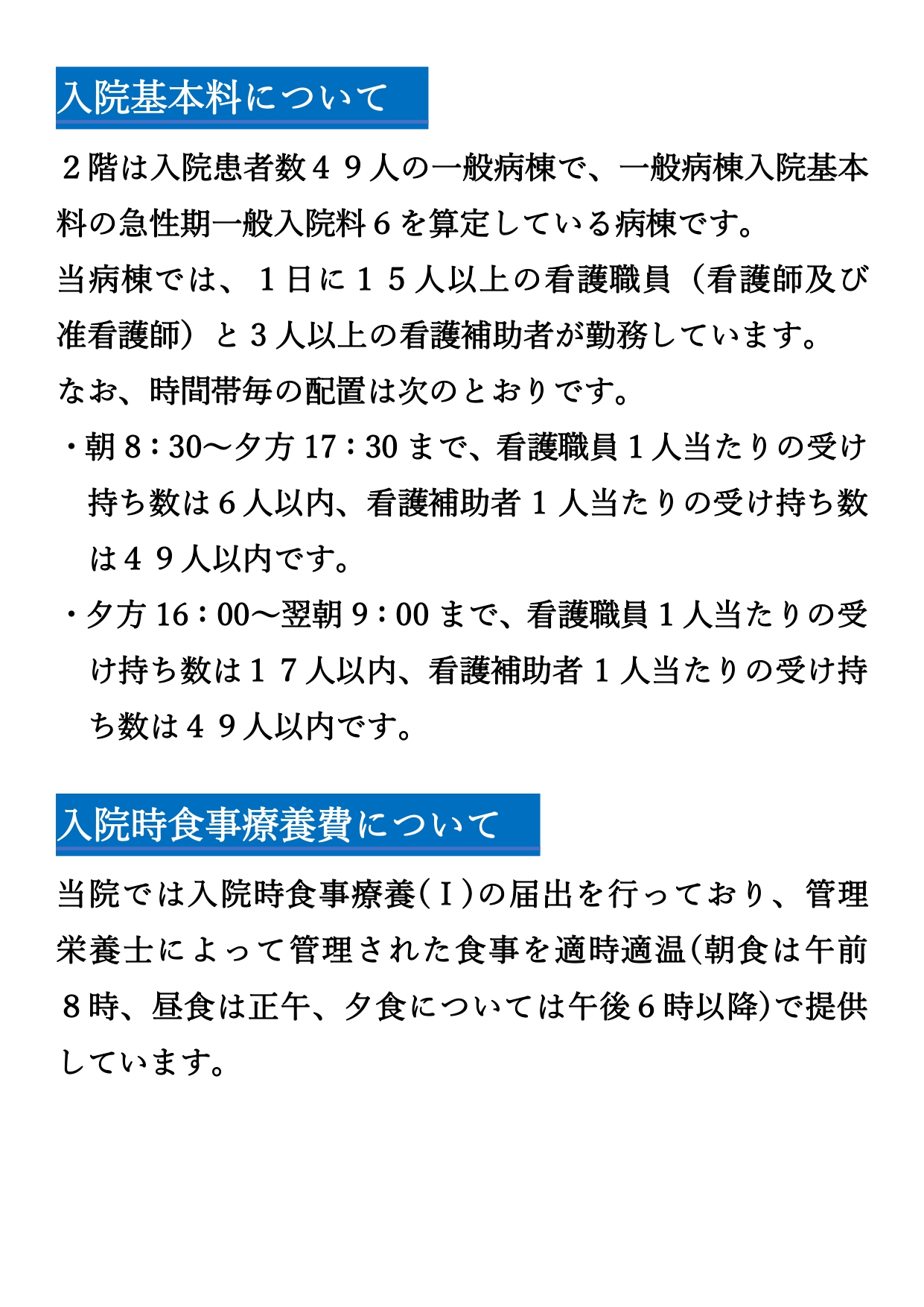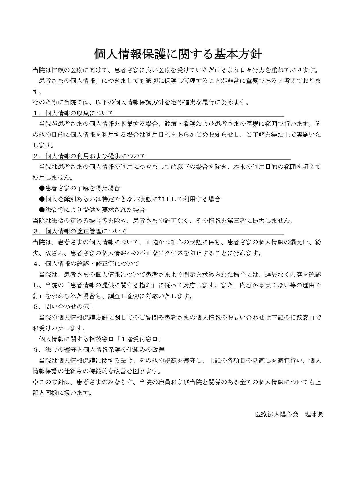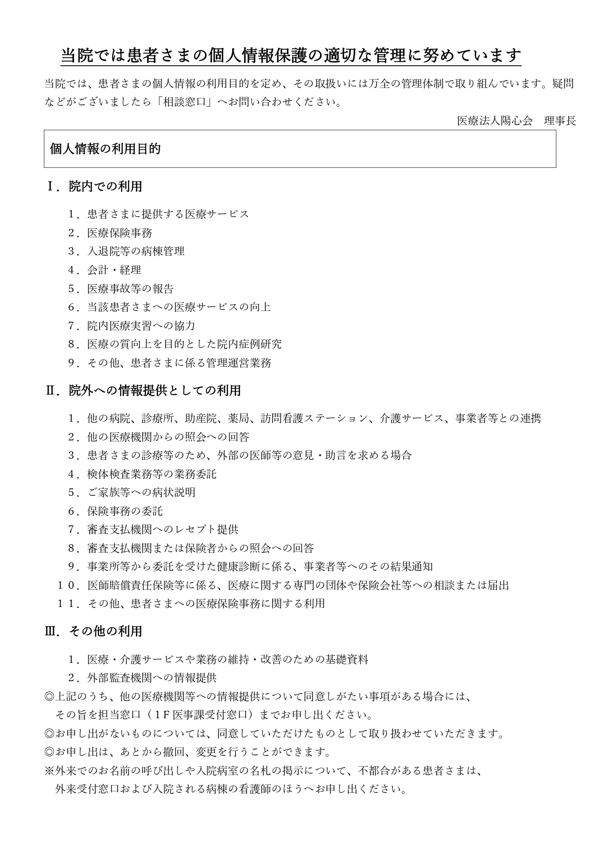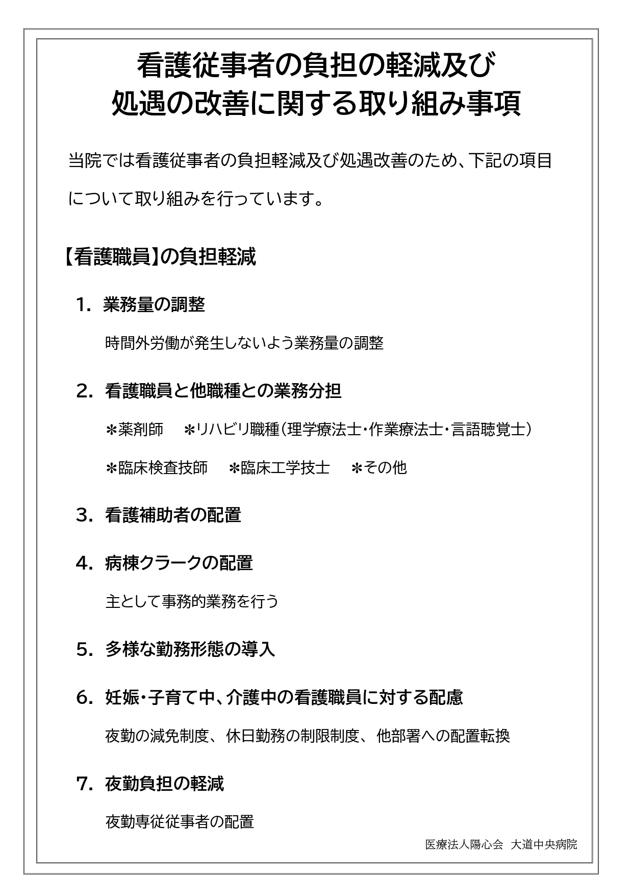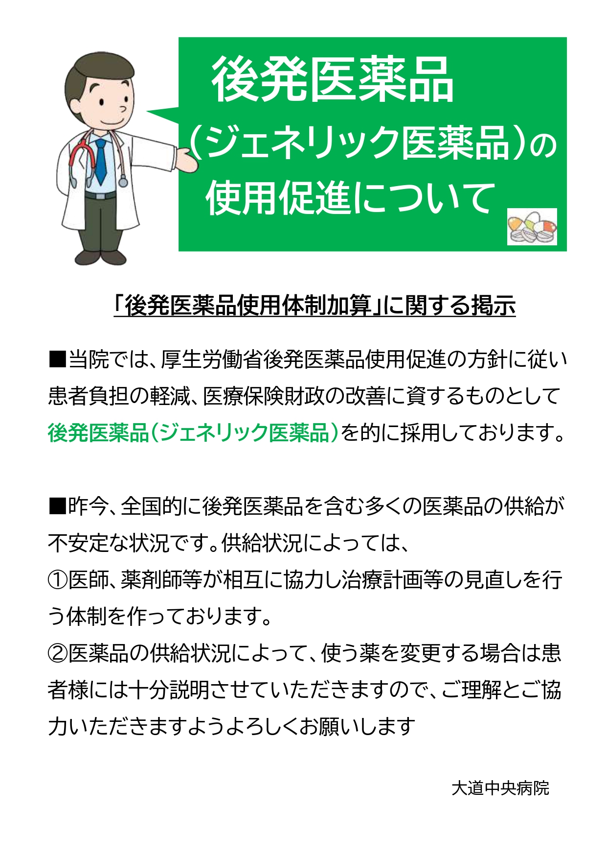 医療法人陽心会 大道中央病院 ■ 大道中央病院 -概要 -担当医の紹介 -病棟のご案内 -理念と基本方針 -医療相談について -患者様の権利と債務 -個人情報の保護について -入院生活について -院内掲示物 メニュー ■ 大道中央病院 -概要 -担当医の紹介 -病棟のご案内 -理念と基本方針 -医療相談について -患者様の権利と債務 -個人情報の保護について -入院生活について -院内掲示物 院内掲示物 2024年度の診療報酬改定を機に、医療法や健康保険法等により、病院内に掲示している書面等を病院ホームページへ掲載することが義務付けられました。大道中央病院では、院内に掲示されている実際の掲示物をそのまま公開いたします。画像をクリックすると、大きな画像でお読みいただけます。なお、掲示物は事前の予告なく更新いたします。あらかじめご了承願いします。 個人情報保護に関する基本方針 当院では患者様の個人情報保護の適切な管理に努めています 健康保険外負担料金一覧表 看護従事者の負担の軽減及び処遇の改善に関する取り組み事項 入院基本料、入院時食事療養費について(2階.3階.4階.5階病棟) 院内感染防止対策に関する事項 医療相談室について 医療安全について 後発医薬品の使用促進について(後発医薬品使用体制加算の掲示) 患者様の権利と責務 診療のご案内厚生労働大臣の定める掲示事項・施設基準の届出一覧 医療DX推進体制整備加算 「個別の診療報酬の算定項目の分かる明細書」の発行について