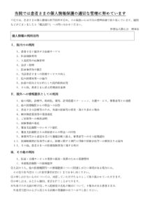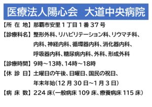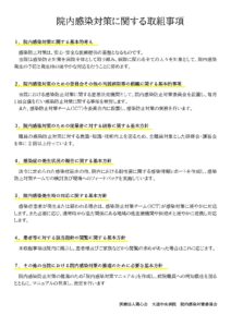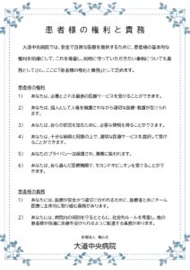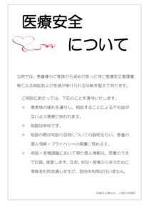 医療法人陽心会 大道中央病院 ■ 大道中央病院 -概要 -担当医の紹介 -病棟のご案内 -理念と基本方針 -医療相談について -患者様の権利と債務 -個人情報の保護について -入院生活について ■ 院内掲示物 -個人情報保護に関する基本方針 -当院では患者様の個人情報保護の適切な管理に努めています -健康保険外負担料金一覧表 -看護従事者の負担の軽減及び処遇の改善に関する取り組み事項 -入院基本料、入院時食事療養費について(2階.3階.4階.5階病棟) -院内感染防止対策に関する事項 -医療相談について -医療安全について -後発医薬品の使用促進について(後発医薬品使用体制加算の掲示) -診療のご案内 -厚生労働大臣の定める掲示事項・施設基準の届出一覧 -医療DX推進体制整備加算 -「個別の診療報酬の算定項目の分かる明細書」の発行について メニュー ■ 大道中央病院 -概要 -担当医の紹介 -病棟のご案内 -理念と基本方針 -医療相談について -患者様の権利と債務 -個人情報の保護について -入院生活について ■ 院内掲示物 -個人情報保護に関する基本方針 -当院では患者様の個人情報保護の適切な管理に努めています -健康保険外負担料金一覧表 -看護従事者の負担の軽減及び処遇の改善に関する取り組み事項 -入院基本料、入院時食事療養費について(2階.3階.4階.5階病棟) -院内感染防止対策に関する事項 -医療相談について -医療安全について -後発医薬品の使用促進について(後発医薬品使用体制加算の掲示) -診療のご案内 -厚生労働大臣の定める掲示事項・施設基準の届出一覧 -医療DX推進体制整備加算 -「個別の診療報酬の算定項目の分かる明細書」の発行について 院内掲示物 2024年度の診療報酬改定を機に、医療法や健康保険法等により、病院内に掲示している書面等を病院ホームページへ掲載することが義務付けられました。大道中央病院では、院内に掲示されている実際の掲示物をそのまま公開いたします。画像をクリックすると、大きな画像でお読みいただけます。なお、掲示物は事前の予告なく更新いたします。あらかじめご了承願いします。個人情報保護に関する基本方針当院では患者様の個人情報保護の適切な管理に努めています健康保険外負担料金一覧表看護従事者の負担の軽減及び処遇の改善に関する取り組み事項入院基本料、入院時食事療養費について(2階.3階.4階.5階病棟)院内感染防止対策に関する事項医療相談について医療安全について後発医薬品の使用促進について(後発医薬品使用体制加算の掲示)患者様の権利と責務診療のご案内厚生労働大臣の定める掲示事項・施設基準の届出一覧医療DX推進体制整備加算「個別の診療報酬の算定項目の分かる明細書」の発行について 個人情報保護に関する基本方針 当院では患者様の個人情報保護の適切な管理に努めています 健康保険外負担料金一覧表 看護従事者の負担の軽減及び処遇の改善に関する取り組み事項 入院基本料、入院時食事療養費について(2階.3階.4階.5階病棟) 院内感染防止対策に関する事項 医療相談室について 医療安全について 後発医薬品の使用促進について(後発医薬品使用体制加算の掲示) 患者様の権利と責務 診療のご案内厚生労働大臣の定める掲示事項・施設基準の届出一覧 医療DX推進体制整備加算 「個別の診療報酬の算定項目の分かる明細書」の発行について